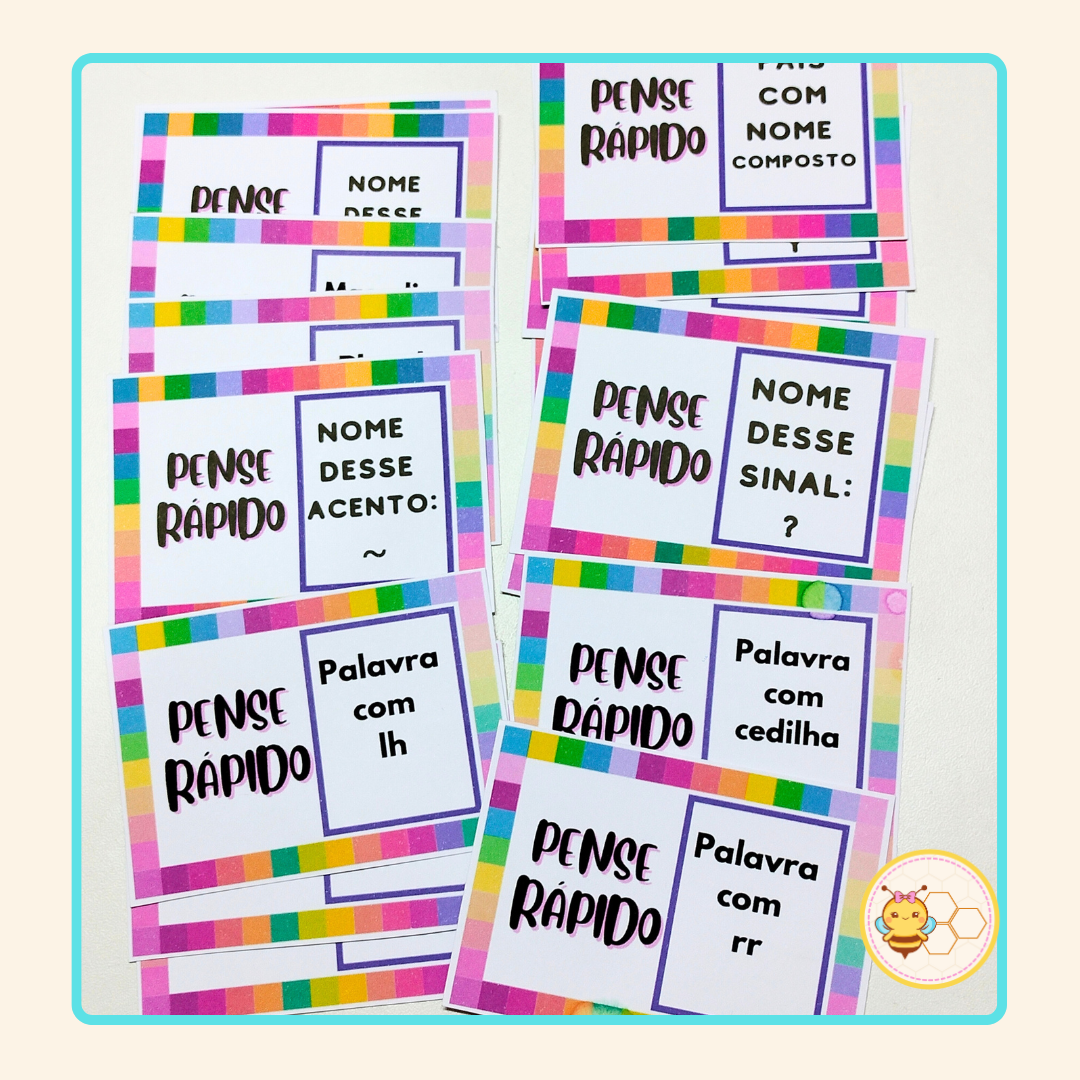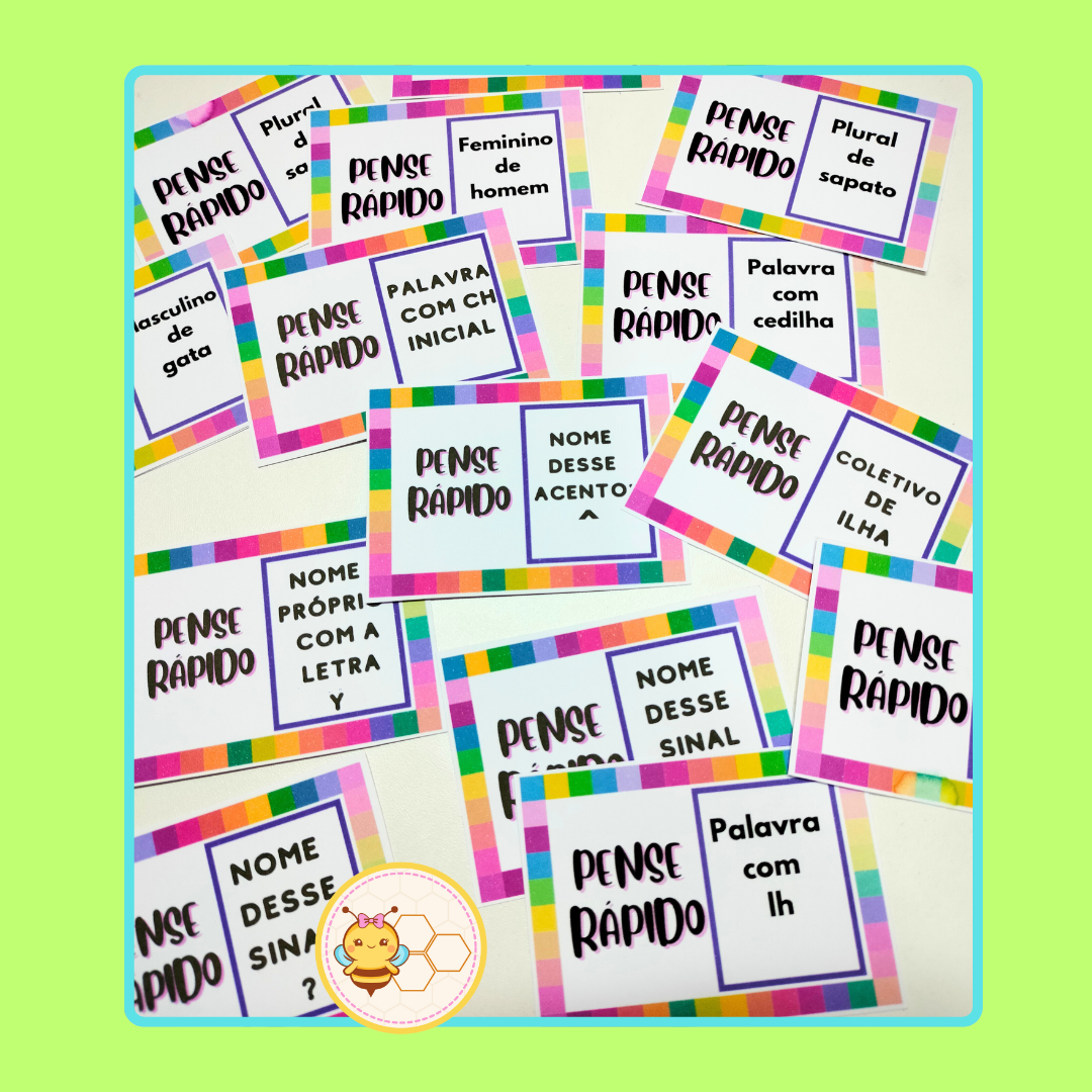 O Pense Rápido é um material em PDF que traz questões interativas focadas em conceitos fundamentais da língua portuguesa, como palavras com “lh” e “nh”, coletivo, aumentativo, plural , substantivo, verbo , pontuação, sílabas, adjetivo, entre outros.