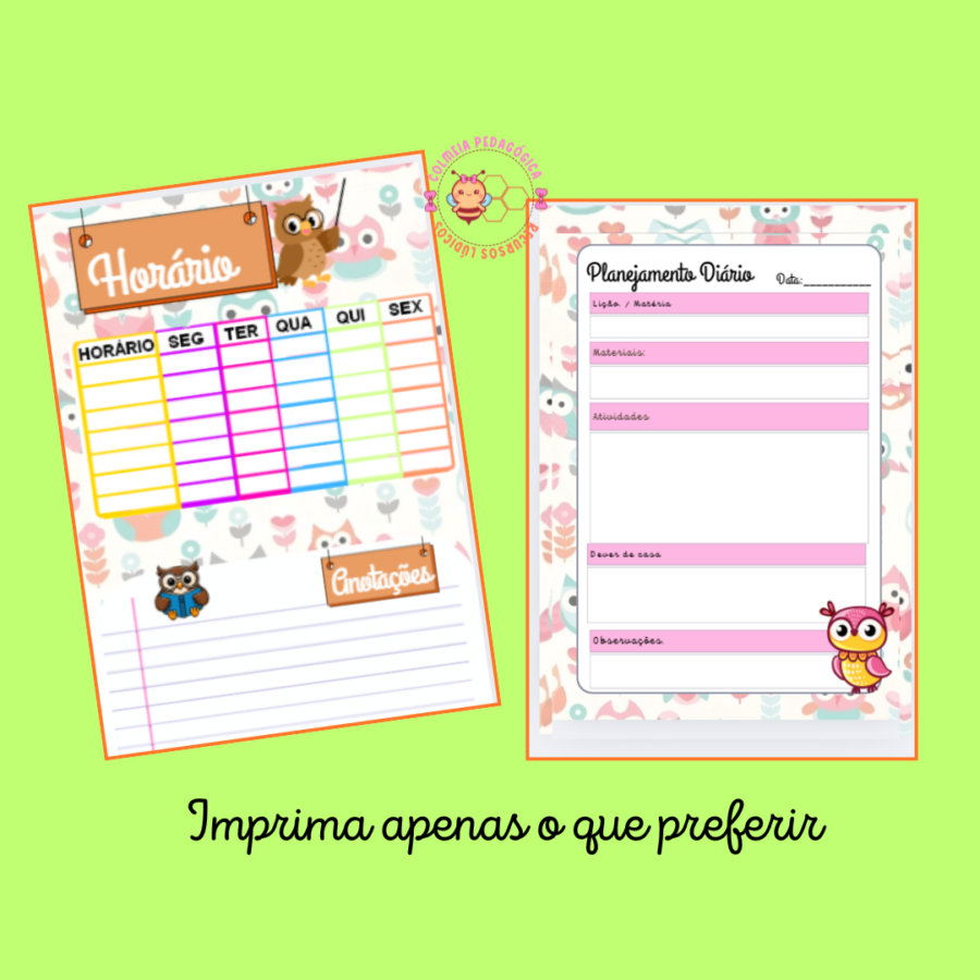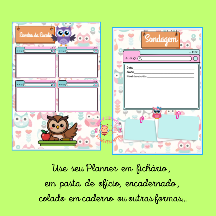 - Capas, aniversariantes, lista da turma, controle de notas, tarefas de casa, planejamento diário, controle de projetos, calendário, horário de aula, ocorrências, eventos da escola, sondaem e observação do aluno…