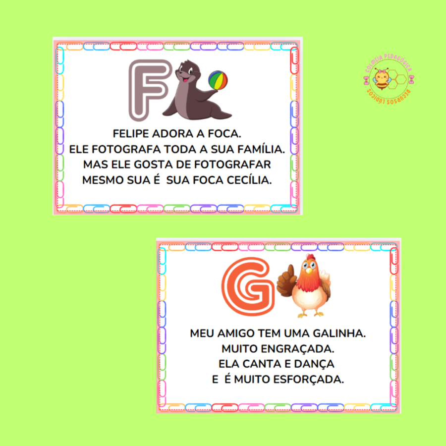Cada ficha apresenta um texto curto, em letra bastão, com vocabulário simples e adequado à fase de alfabetização, contemplando todas as letras do alfabeto.